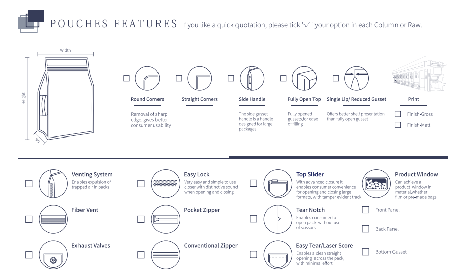 Quad seal bags have a reinforced structure that make them sturdy and suitable for heavier items. Its design features gussets on sides, making the bag expandable for more packaging space. This shape and format makes the bag easy to fill and self-standing as a shelf display. Our gusset bags can also be made more economical and environment-friendly as added benefits to your company.